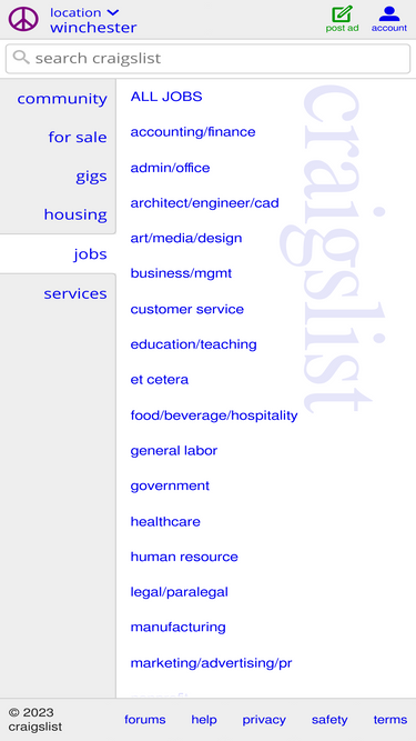 Winchester community events for sale gigs housing jobs resumes services all adminoffice business customer service education engineering etcetera finance foodbevhosp general labor government healthcare human resource legal manufacturing marketing media nonprofit real estate retailwholesale sales salonspafitness science security skilled. Hide this posting restore restore this posting. Hide this posting restore restore this posting.